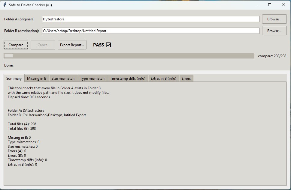 If the result says PASS, the destination folder contains a complete copy of the source folder based on size and structure.